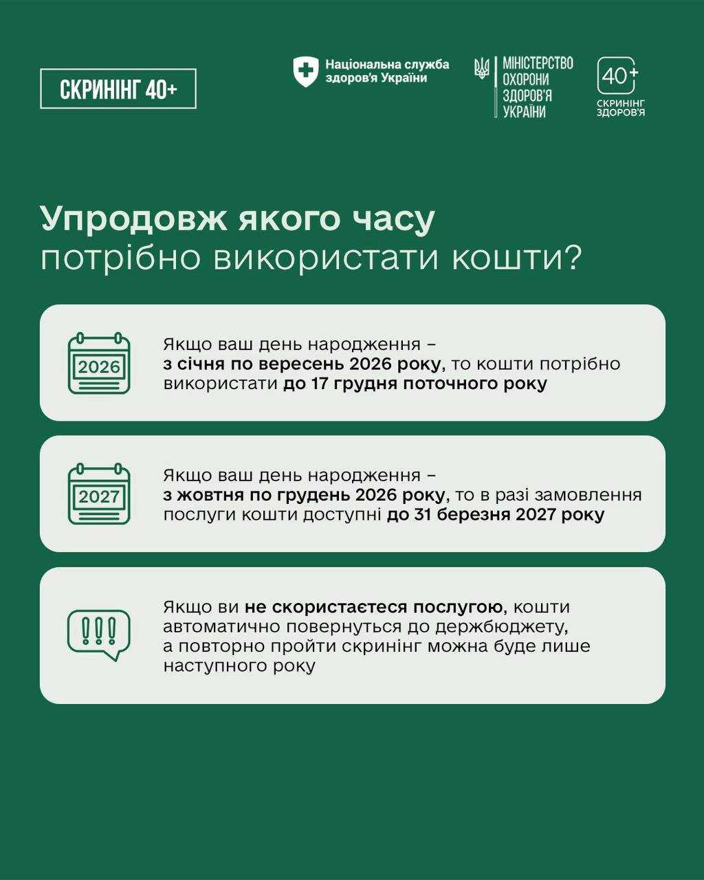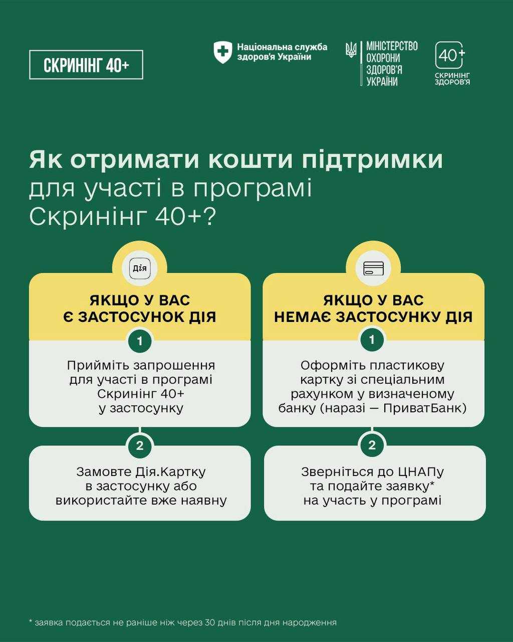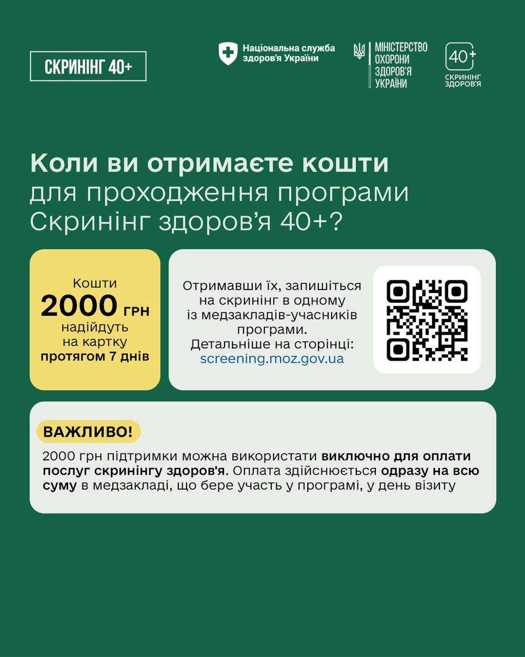 Якщо вам вже виповнилося 40 років і більше, через 30 днів після дня народження ви отримаєте пуш-сповіщення в Дії. Прийміть його та замовте Дія.Картку або скористайтеся вже наявною. Протягом 7 днів на неї надійдуть 2000 грн, які можна використати на скринінг здоров’я.
